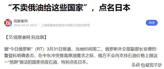 3月31日,俄罗斯外交部副部长安德烈·鲁登科明确表态,俄罗斯绝不会向支持对俄石油限价的国家供应能源,包括日本。