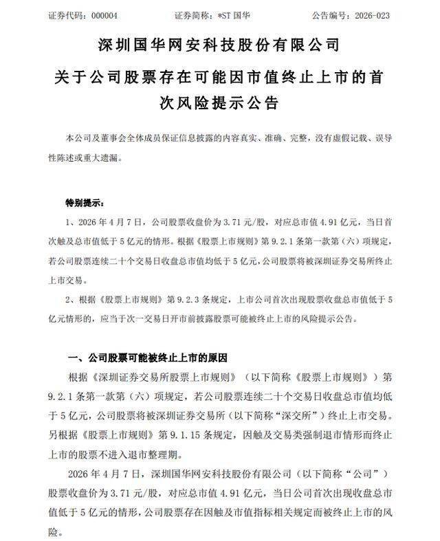 4月7日,*ST国华(000004.SZ)公告称,2026年4月7日公司股票收盘价为3.71元/股,对应总市值4.91亿元,当日首次触及总市值低于5亿元的情形。若连续二十个交易日收盘总市值均低于5亿元,公司股票将被深交所终止上市,且不进入退市整理期。