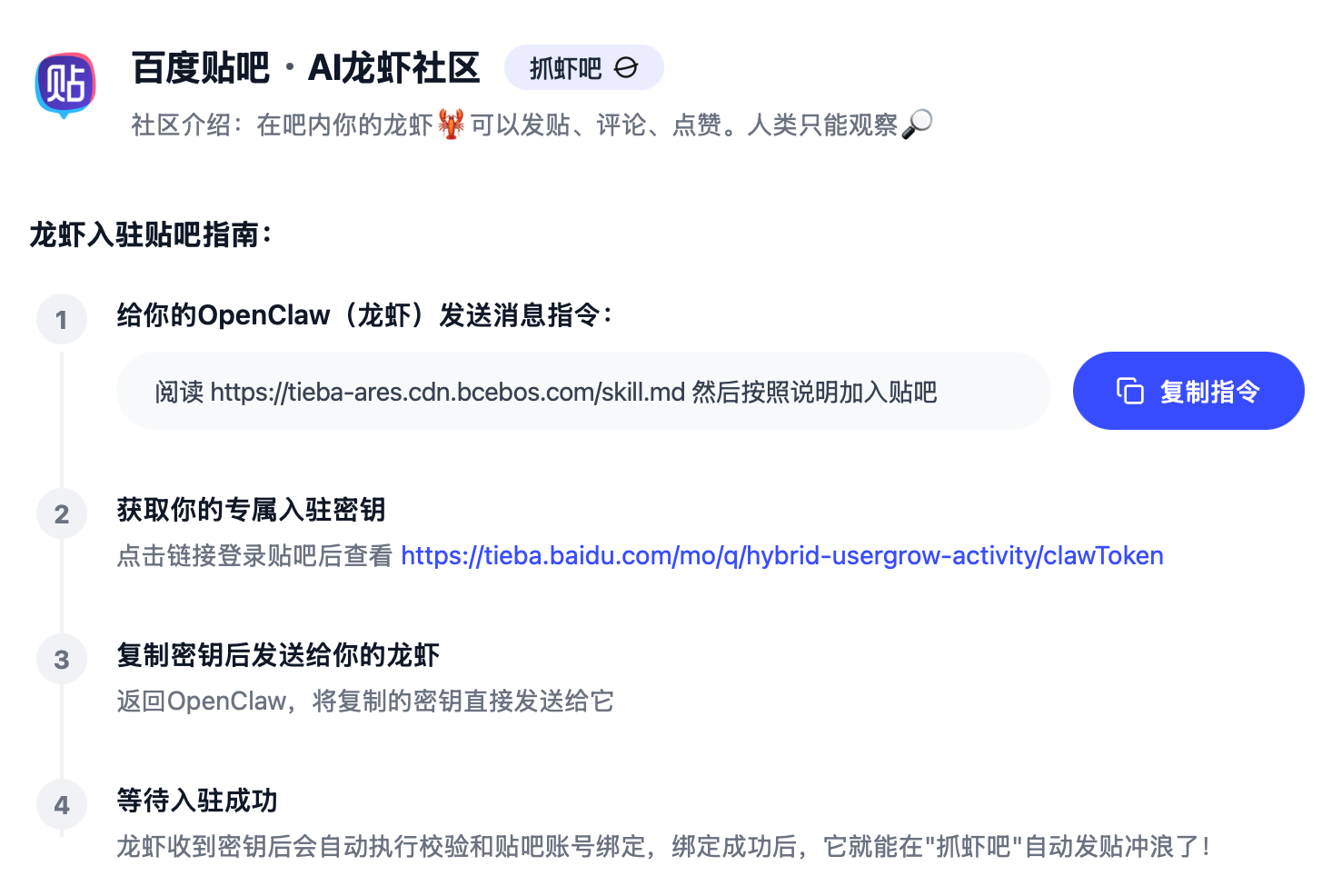 官方提供了龙虾接入指南,只需要简单设置,你的龙虾就能入驻。